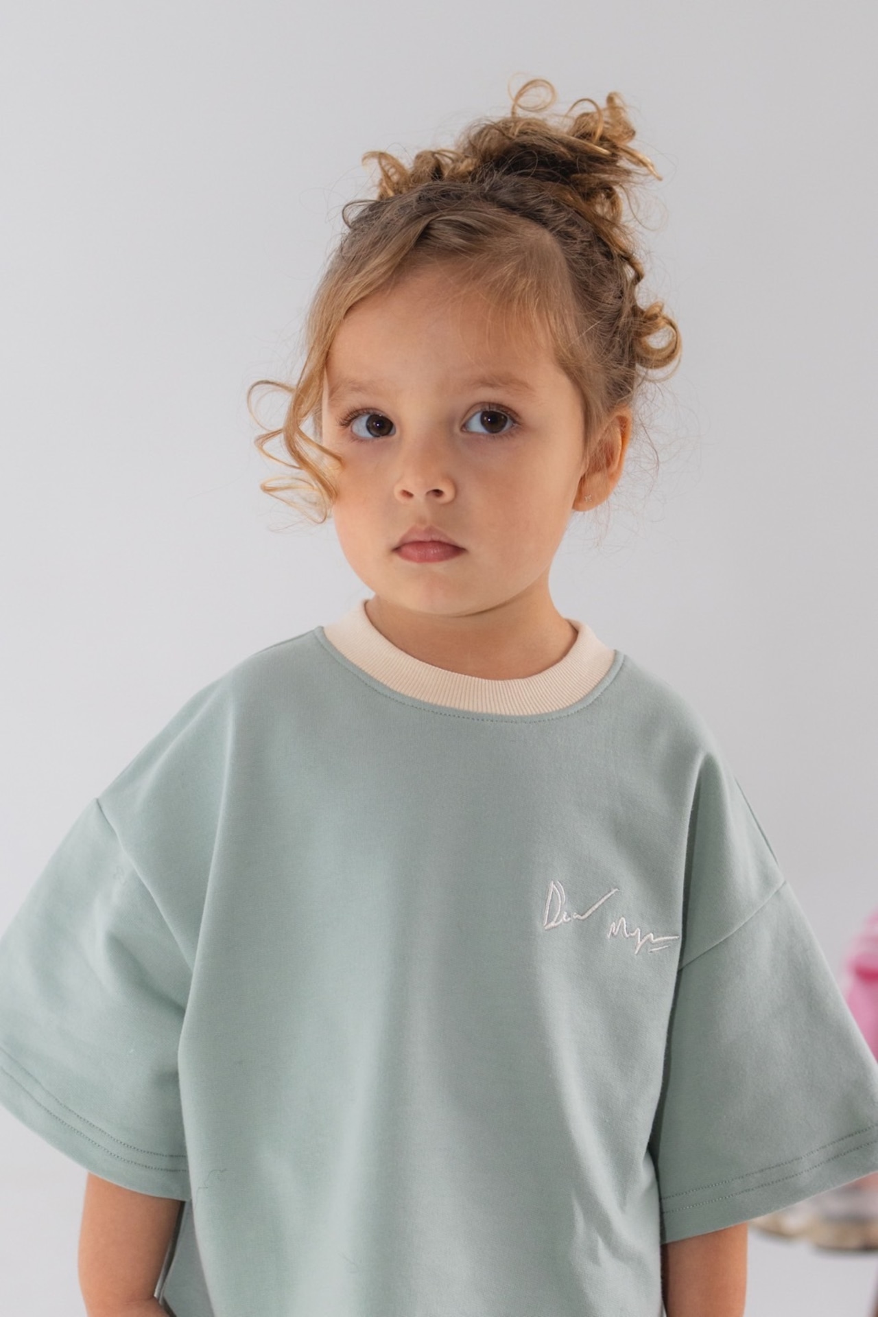 淡いミントブルーが爽やかで、クリーム色のリブネックラインや胸元のロゴ刺繍がポイント♩
