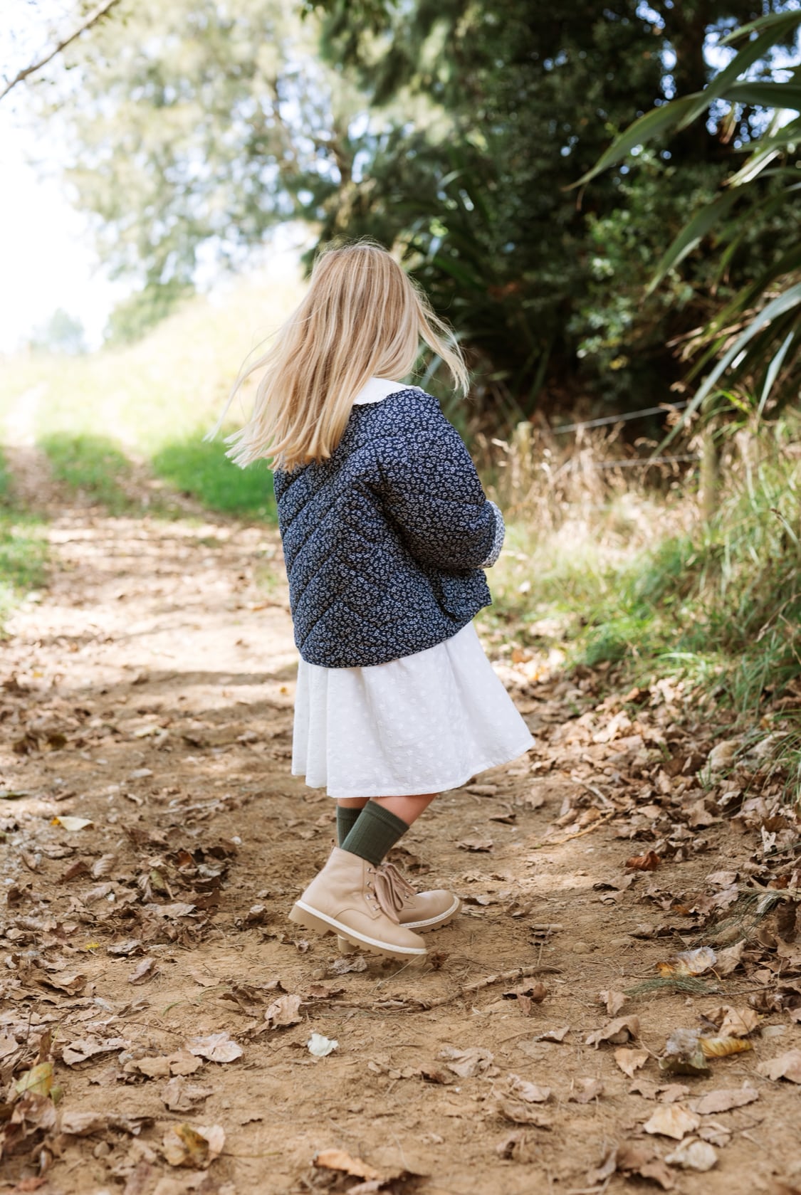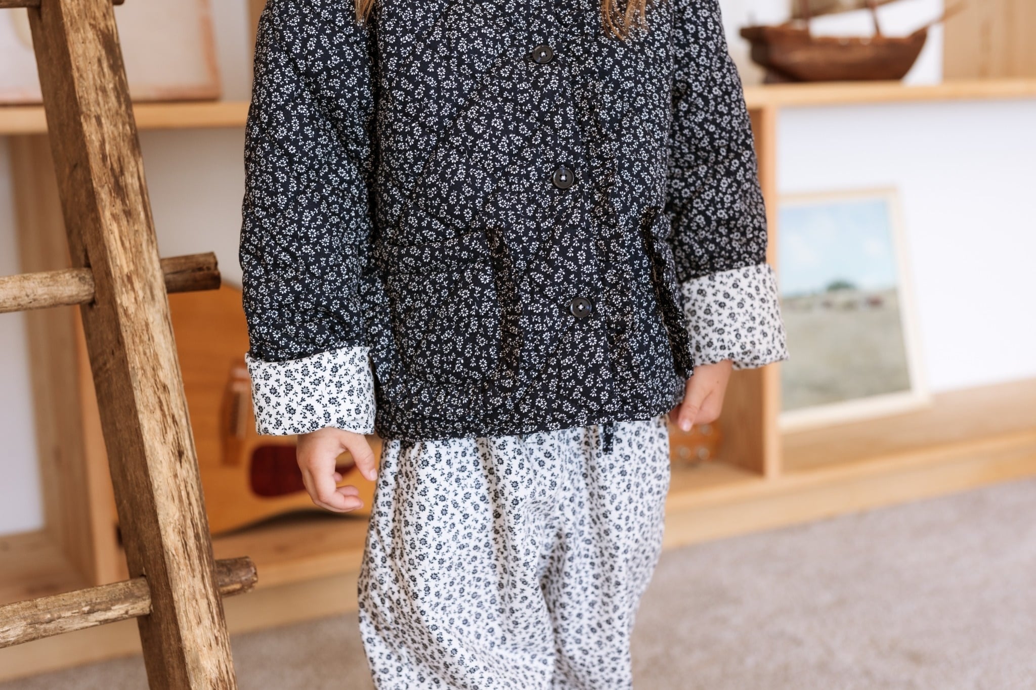 締め付け感なくゆったりとしたシルエットで、外側はネイビーの花柄キルティング、内側はホワイトの花柄裏地でこだわりの一着♩